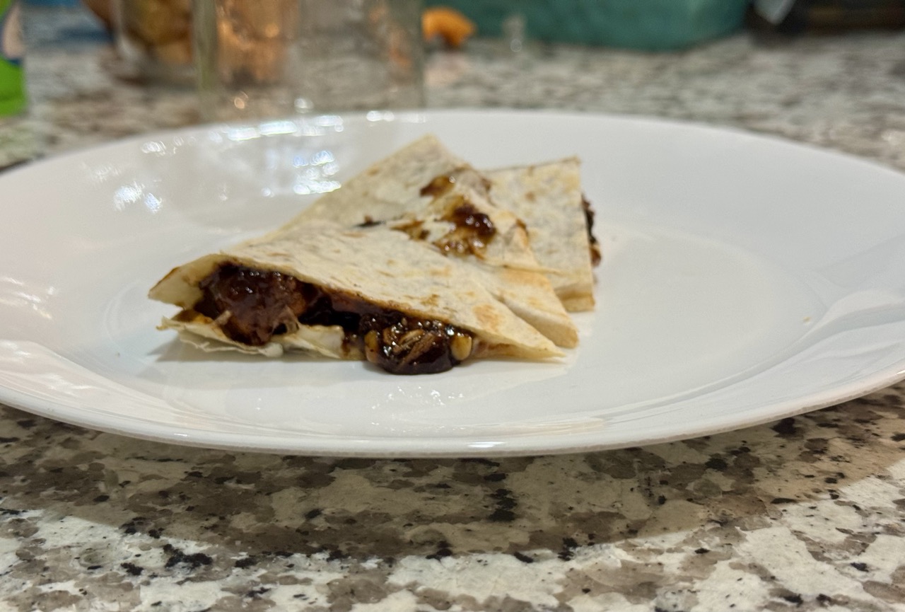 Note: I originally got this recipe from my brother, who called it “Italian Chicken.” It’s hard to say where the name came from; there’s nothing Italian about it. You could argue Asian influence, since soy sauce is the star flavor, but it’s a quesadilla? So I’m going with Unitalian Chicken.